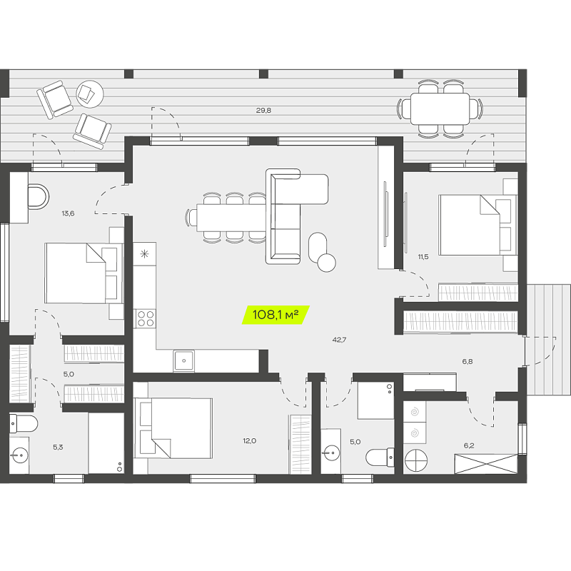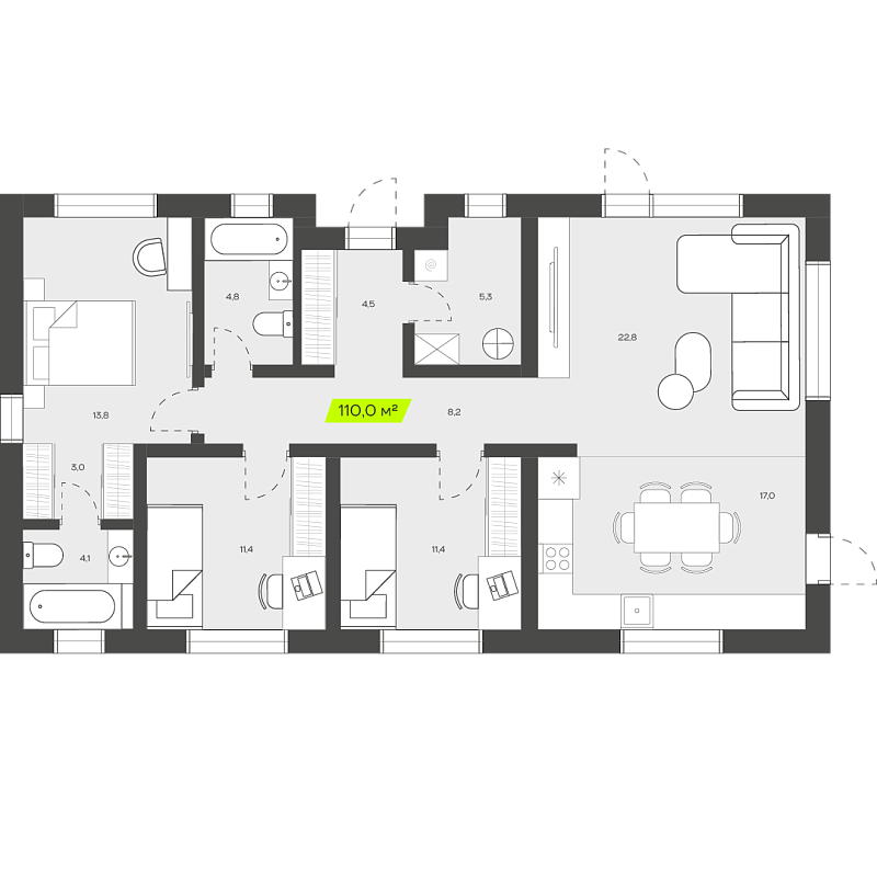 Три спальни обеспечивают достаточное пространство для семьи, позволяя каждому члену иметь собственное место для отдыха и уединения. Это особенно важно для семей с детьми, где каждый ребенок может иметь свою комнату, что способствует развитию независимости и личного пространства