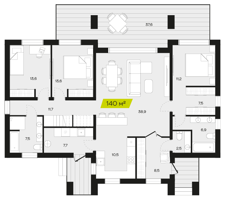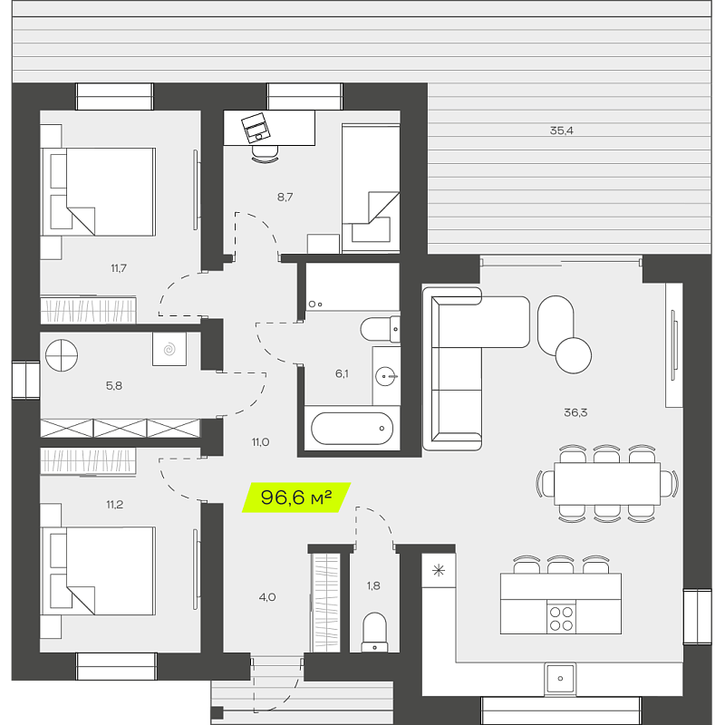 Три спальни обеспечивают достаточное пространство для семьи, позволяя каждому члену иметь собственное место для отдыха и уединения. Это особенно важно для семей с детьми, где каждый ребенок может иметь свою комнату, что способствует развитию независимости и личного пространства