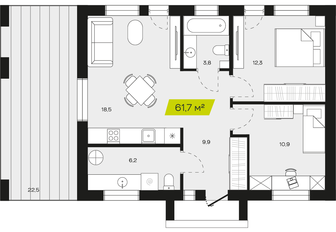 Две спальни обеспечат личным пространством семью с одним или двумя детьми, позволяя всем членам семьи комфортно проводить время дома