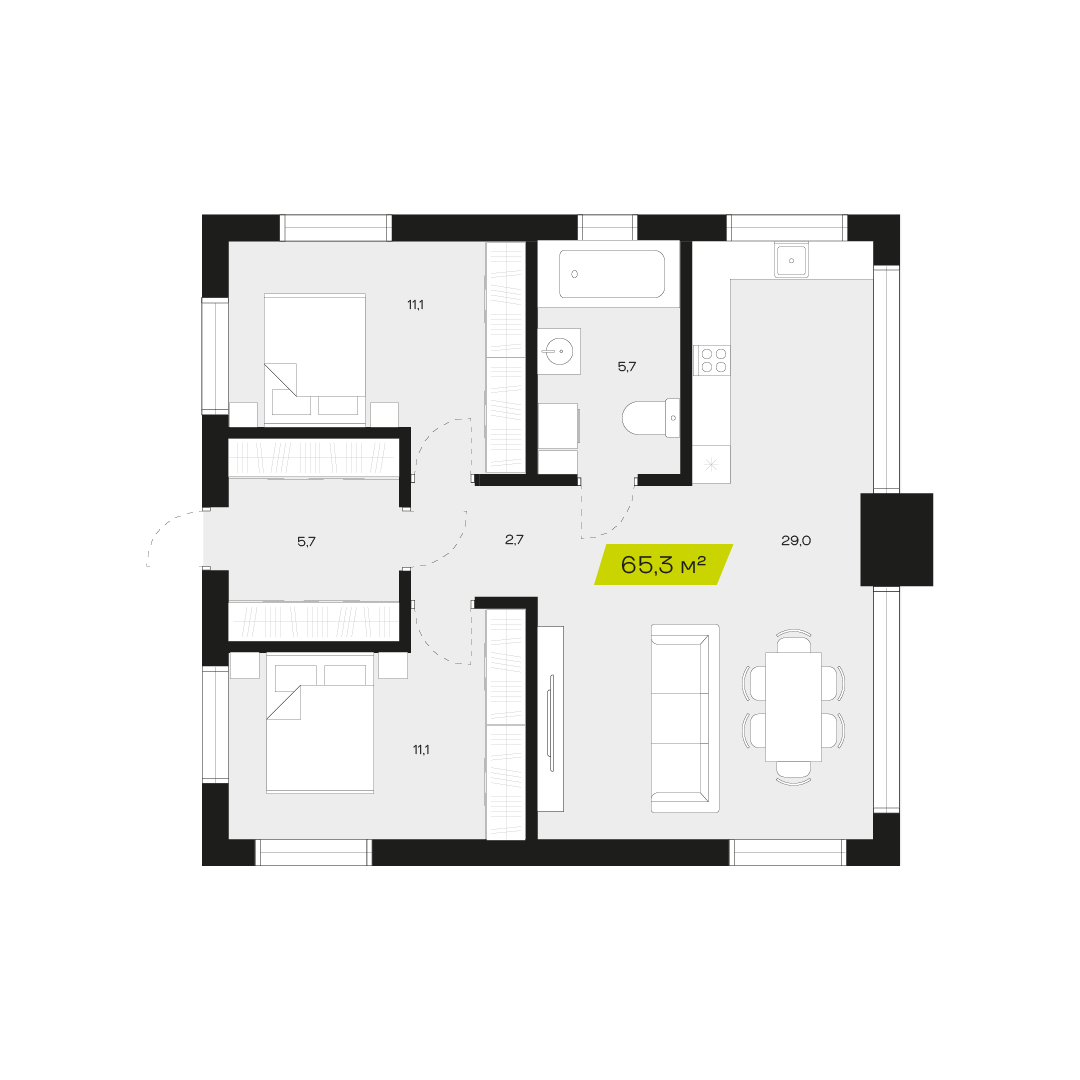 Две спальни обеспечат личным пространством семью с одним или двумя детьми, позволяя всем членам семьи комфортно проводить время дома