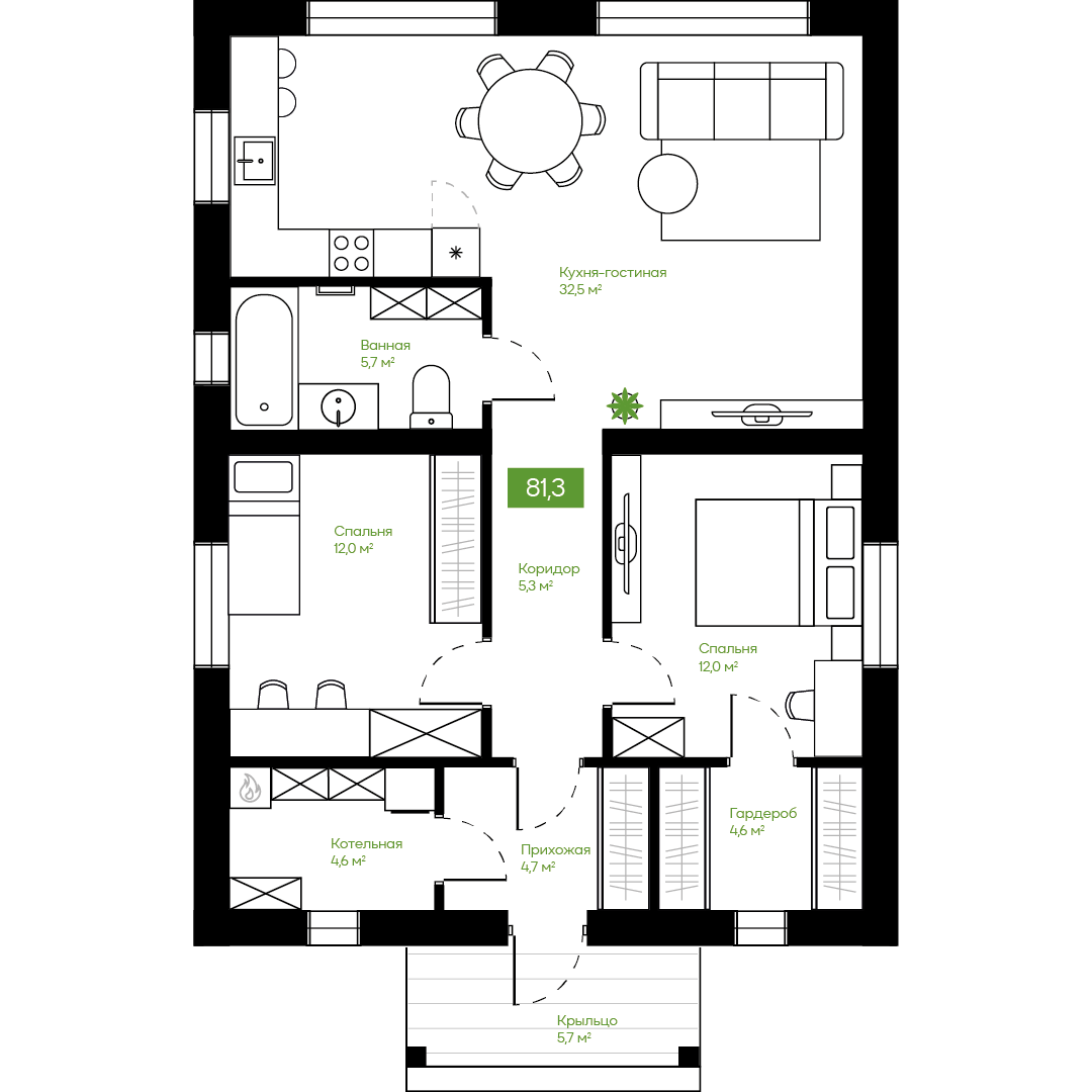 Две спальни обеспечат личным пространством семью с одним или двумя детьми, позволяя всем членам семьи комфортно проводить время дома