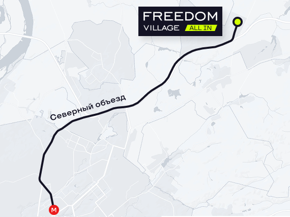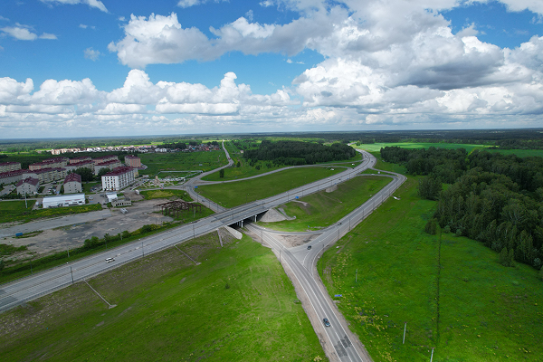 • Четырехполосная трасса с прямым съездом к дороге посёлка, первой развязкой от города