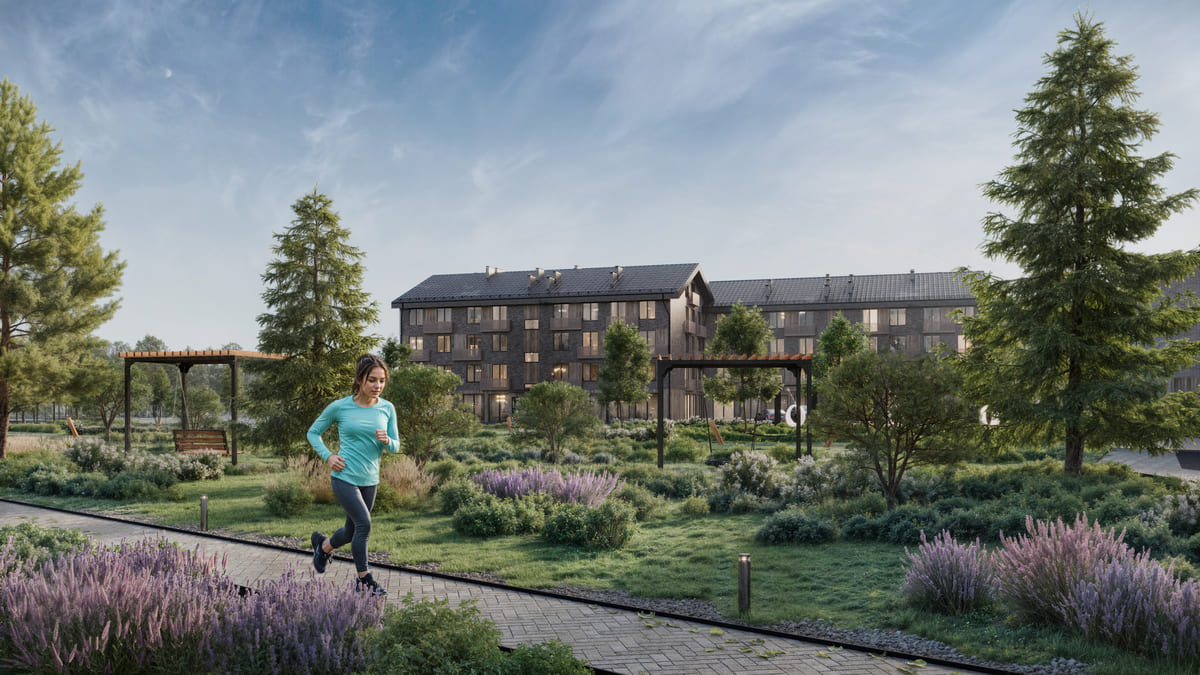 Во дворе появится спортивная зона: workout-зона и спортивная площадка, оборудованная для игр в футбол, волейбол и баскетбол. По периметру двора предусмотрены беговые дорожки.