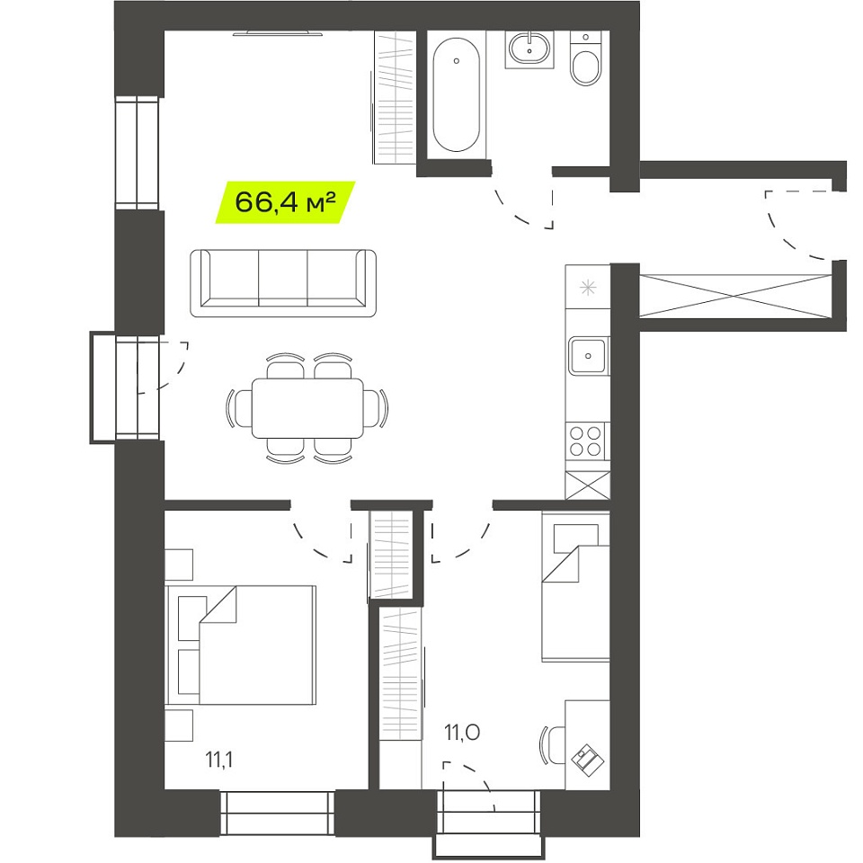 Трехкомнатная студия, 57,19м 2