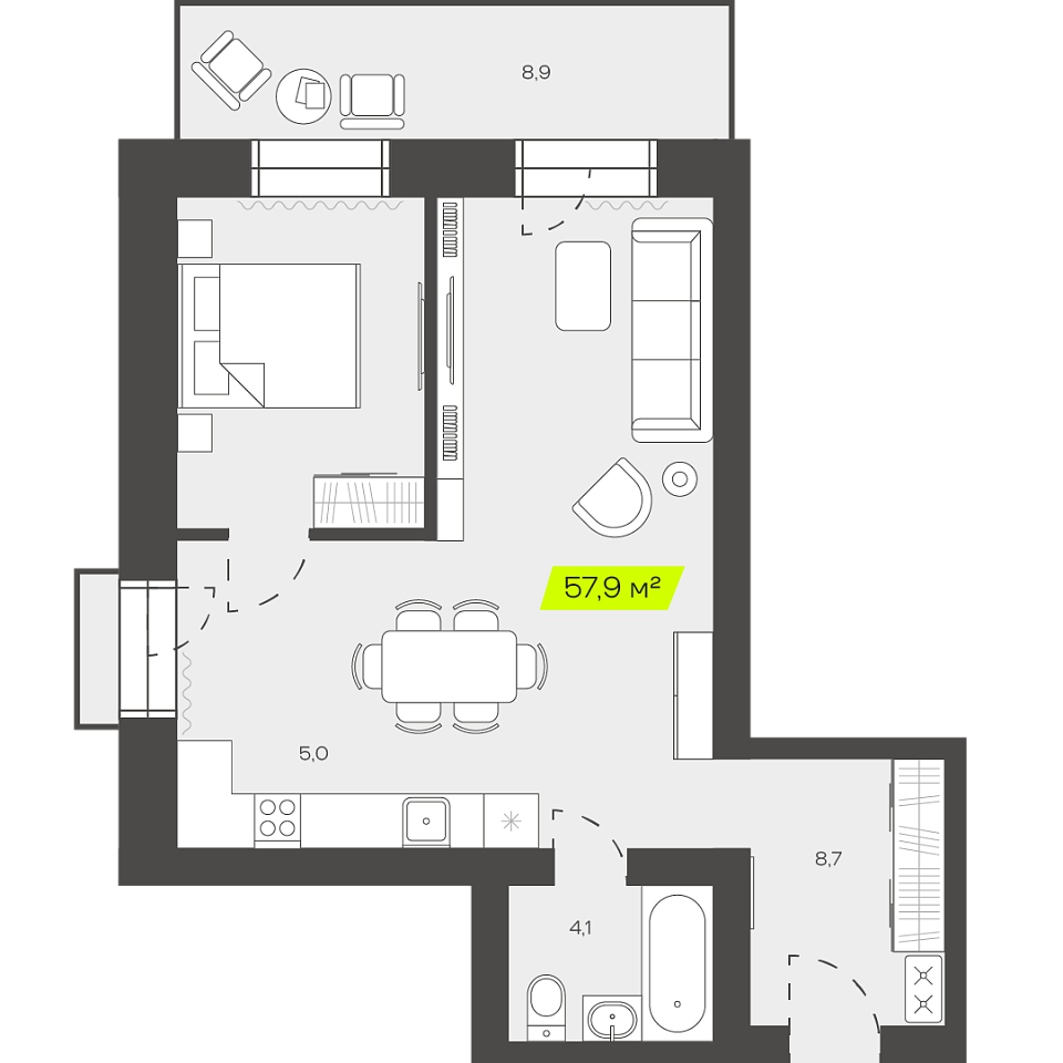 Трехкомнатная студия, 57,19м 2