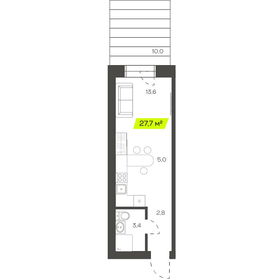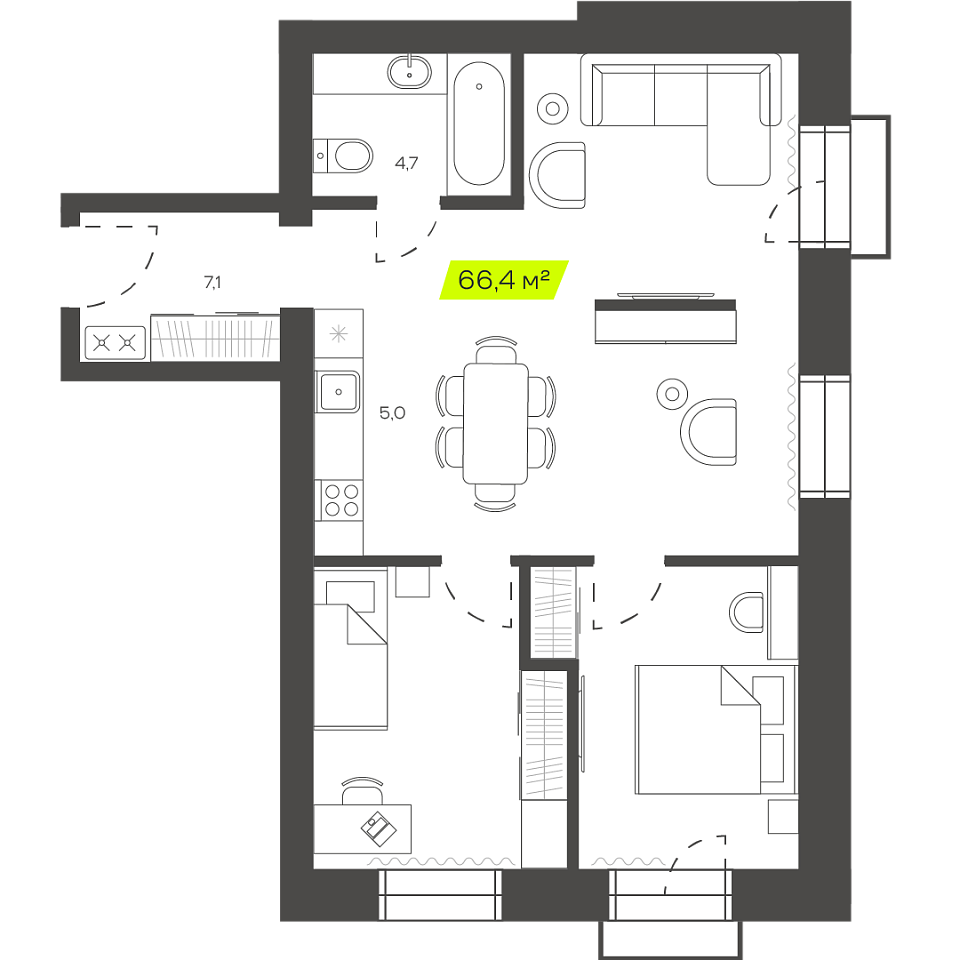 Трехкомнатная студия, 54,89м 2