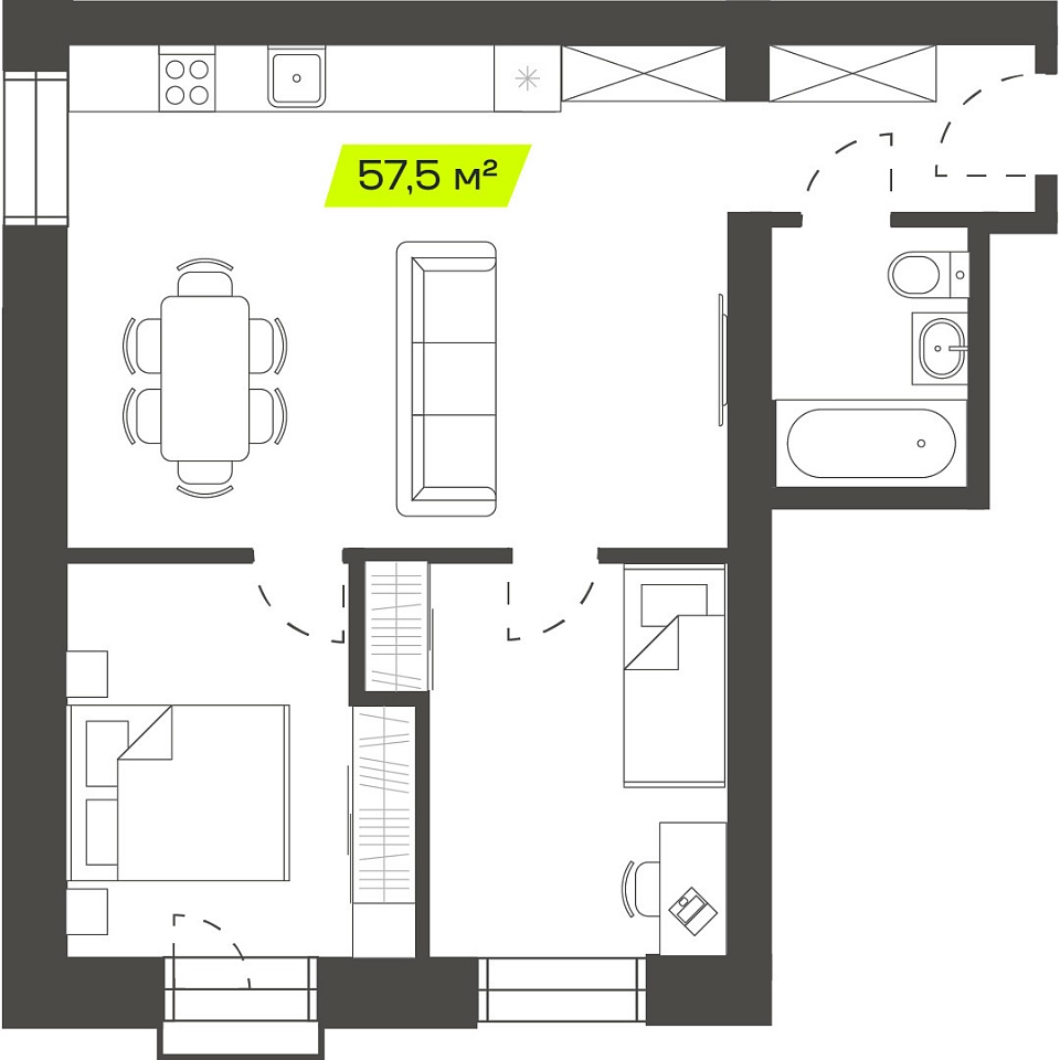 Двухкомнатная студия, 56,96м 2