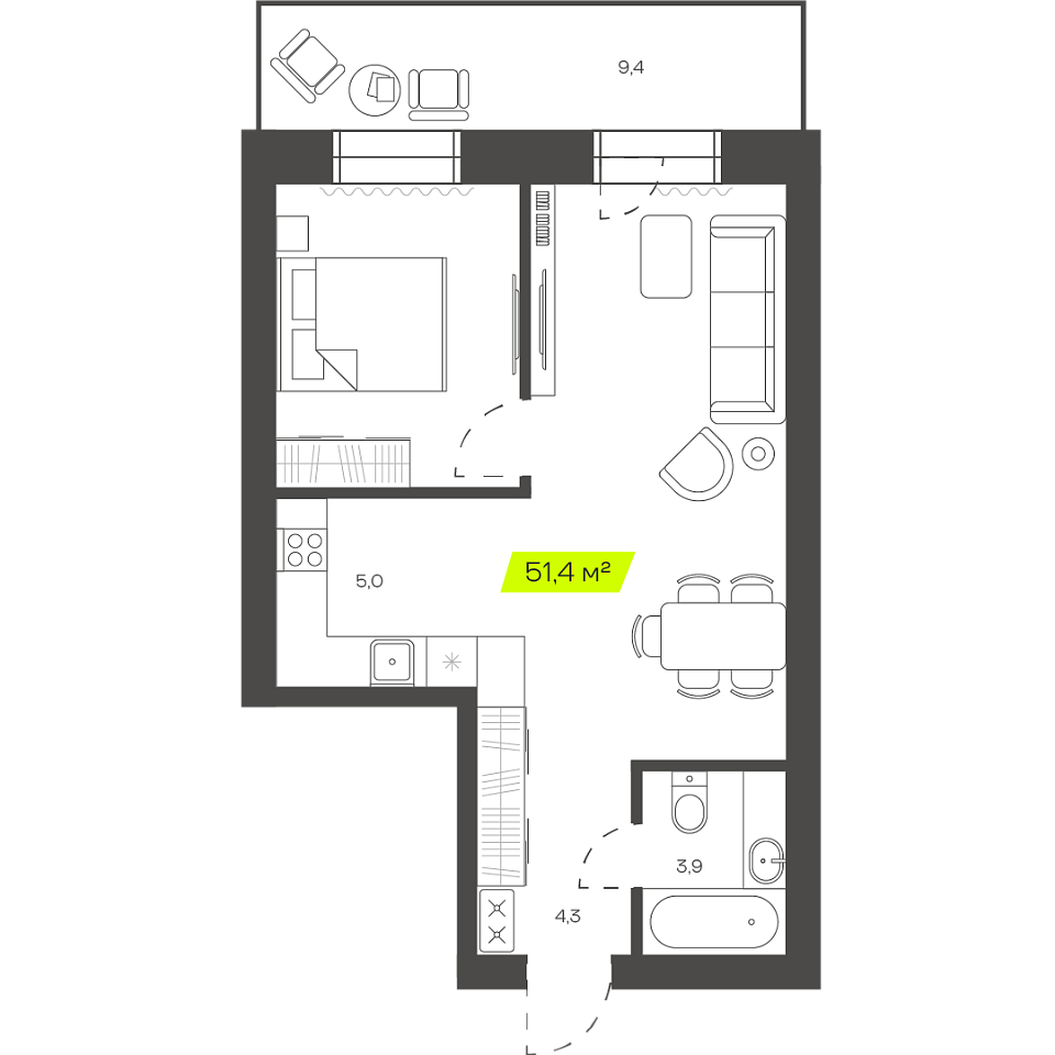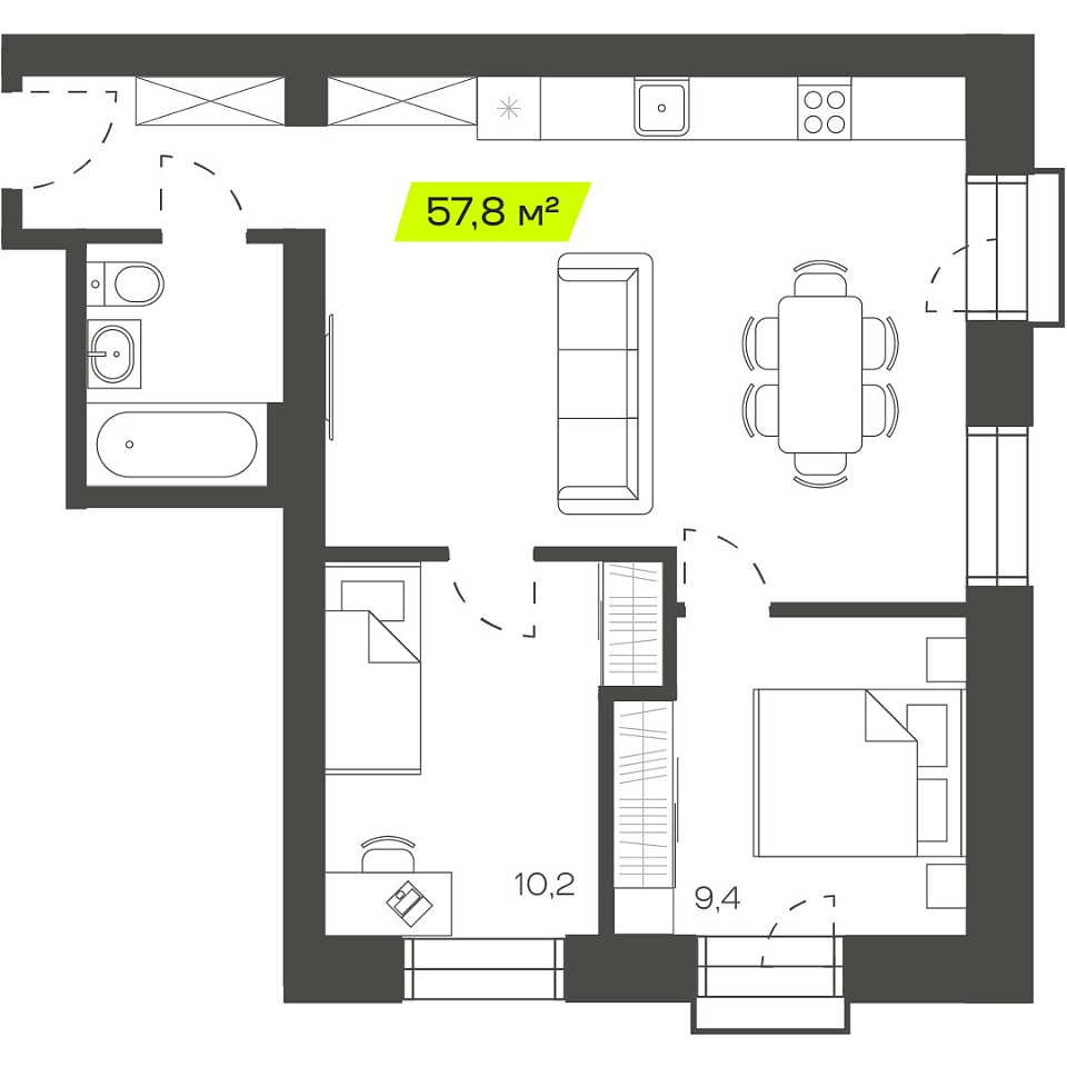 Двухкомнатная студия, 57,87м 2